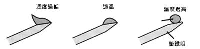錫是低溫易熔及易老化的焊料,溫度低時(shí),錫呈現(xiàn)膠狀不黏,令線路 板的銅箔與零件腳造成假焊。溫度正確適中時(shí),在焊咀的錫呈半圓粒狀,有反光面,是黏著力最佳的時(shí)候,迅速將零件腳與底板電路焊接。溫度過高時(shí),錫呈圓粒 狀,錫點(diǎn)表面的色澤呈啞色,有縐紋,表示錫已老化,會(huì)造成假焊點(diǎn)出現(xiàn)。所以,從鉻鐵咀的錫粒形狀可知何時(shí)焊接是最好的時(shí)候,制作的成功率是怎樣。